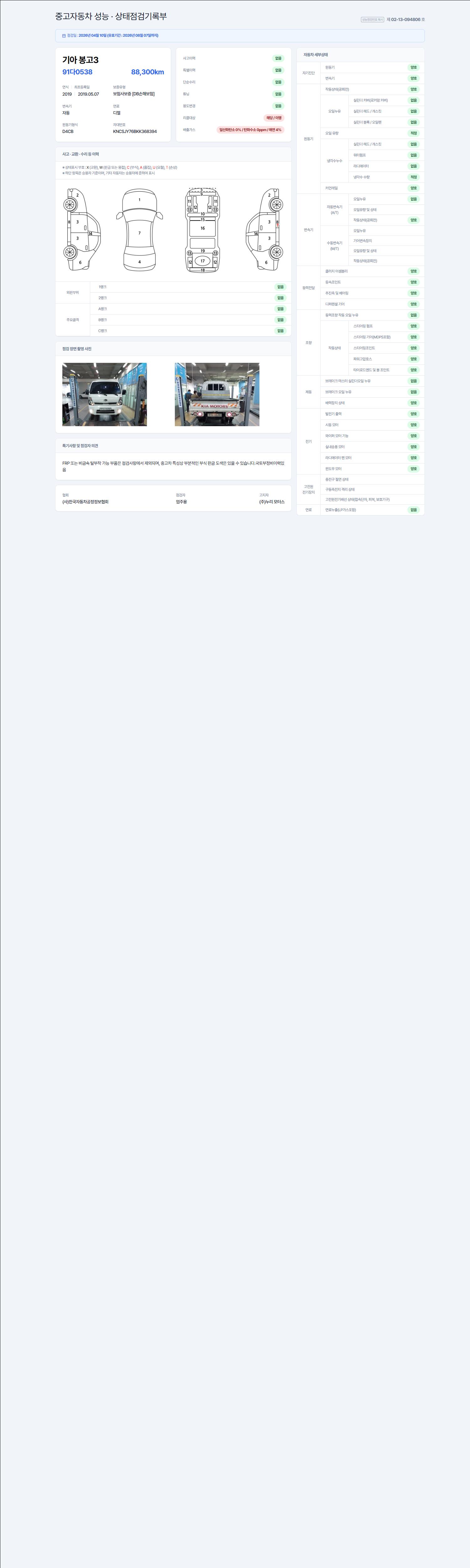 | 주행거리 | 88,357 km | 차량번호 | 91다0538 | 사고유무 | 성능기록부 참조 | 제시번호 | 제 2026066334 호 |