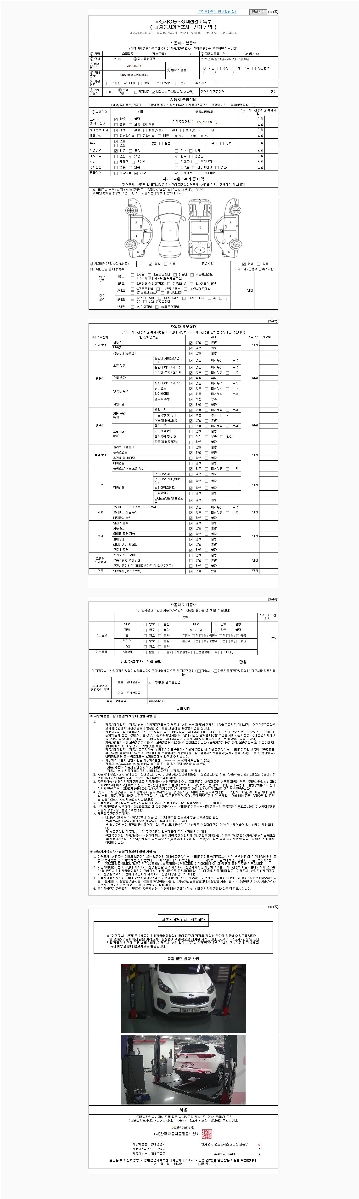 | 주행거리 | 127,287 km | 차량번호 | 354루4185 | 사고유무 | 성능기록부 참조 | 제시번호 | 제 2026047965 호 |