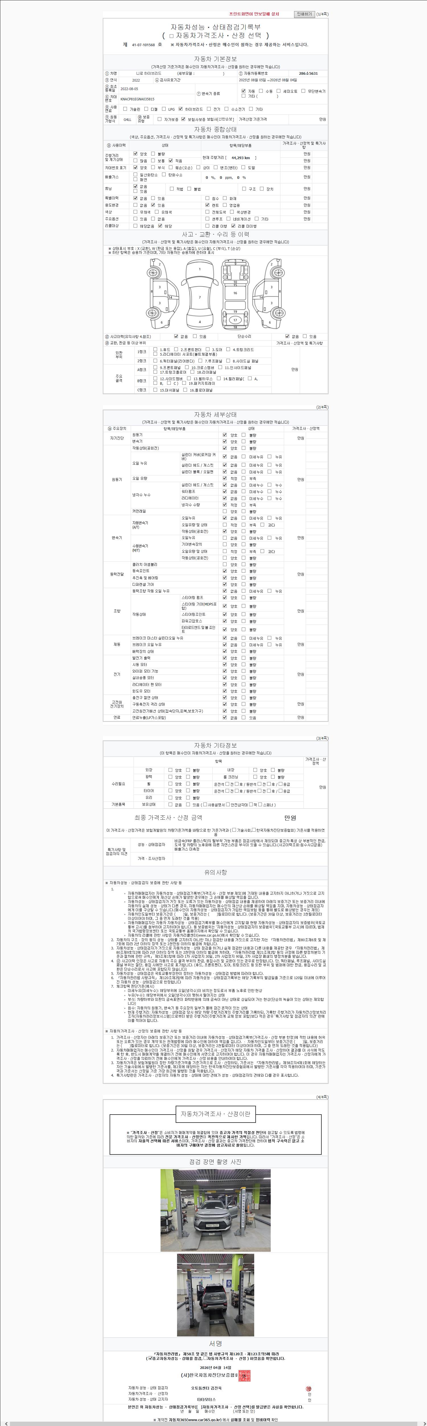 | 주행거리 | 44,293 km | 차량번호 | 286소5631 | 사고유무 | 성능기록부 참조 | 제시번호 | 제 2147483647 호 |