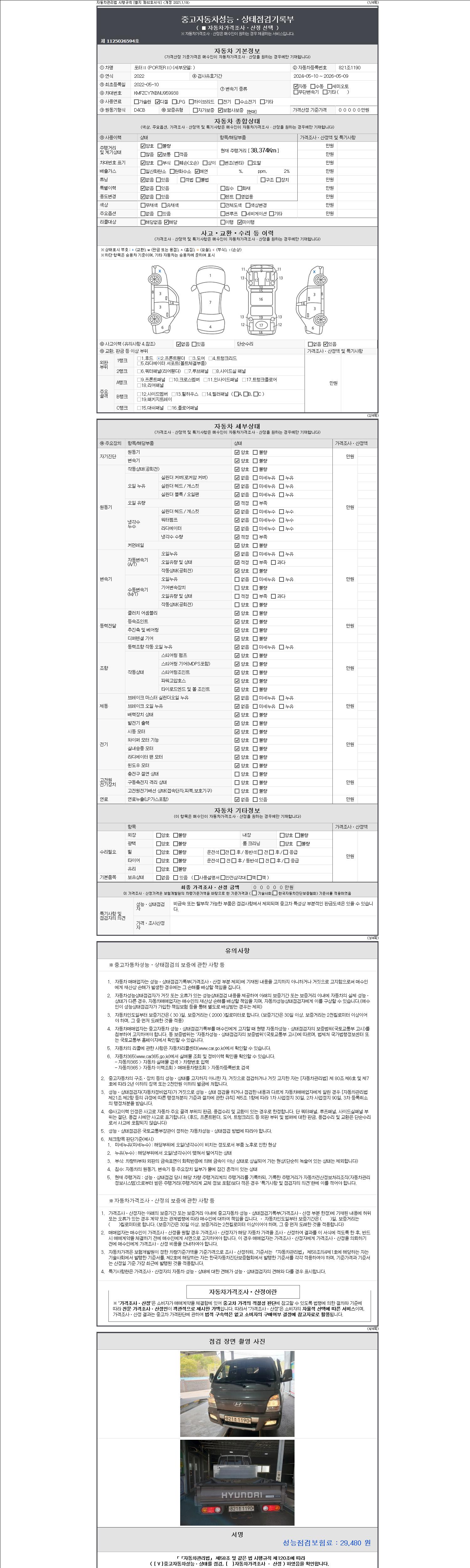 자동차관리법 시행규칙 제120조의 규정에 따라 별지 제 82호서식 《중고자동차 성능, 상태점검 기록부》를 발행한 성능, 상태점검자 및 매매자는 아래의 보증기간 또는 보증거리 이내의 중고자동차, 성능점검 기록부에 기재된 내용과 자동차의 실제 성능, 상태가 다른 경우 계약 또는 관계법령에 따라 매수인에 대하여 책임을 집니다.