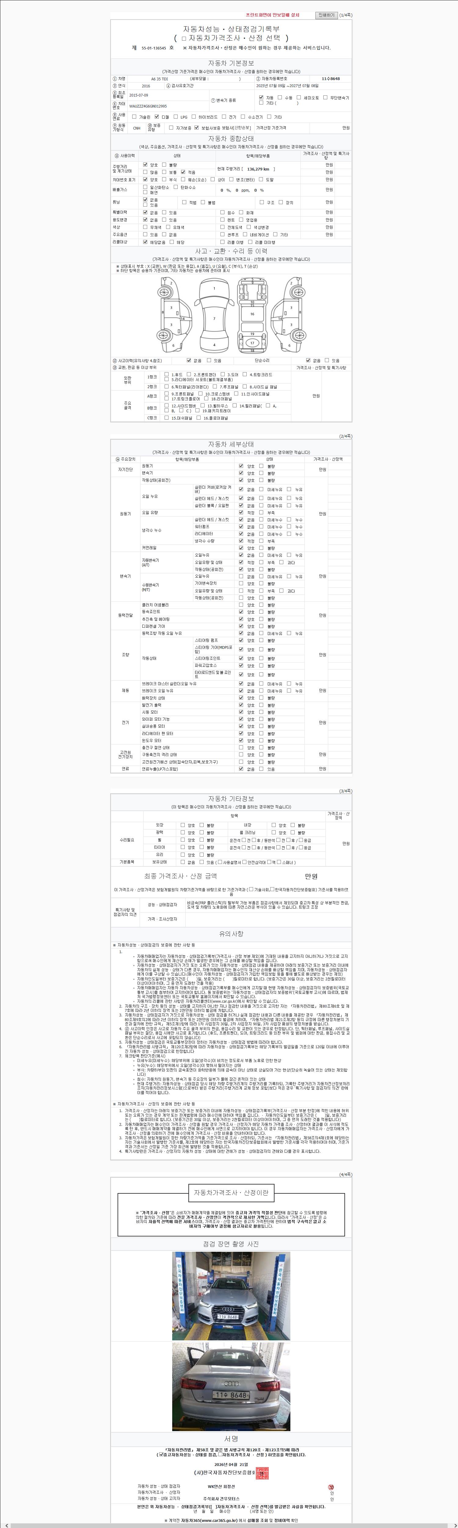 -중고자동차 매매업자를 통해 차량을 구입하실 경우 반드시 "중고자동차 성능, 상태점검 기록부"를 교뷰 받으셔야 하며, 매매업자는 반드시 의무 교부 하여야 압니다.