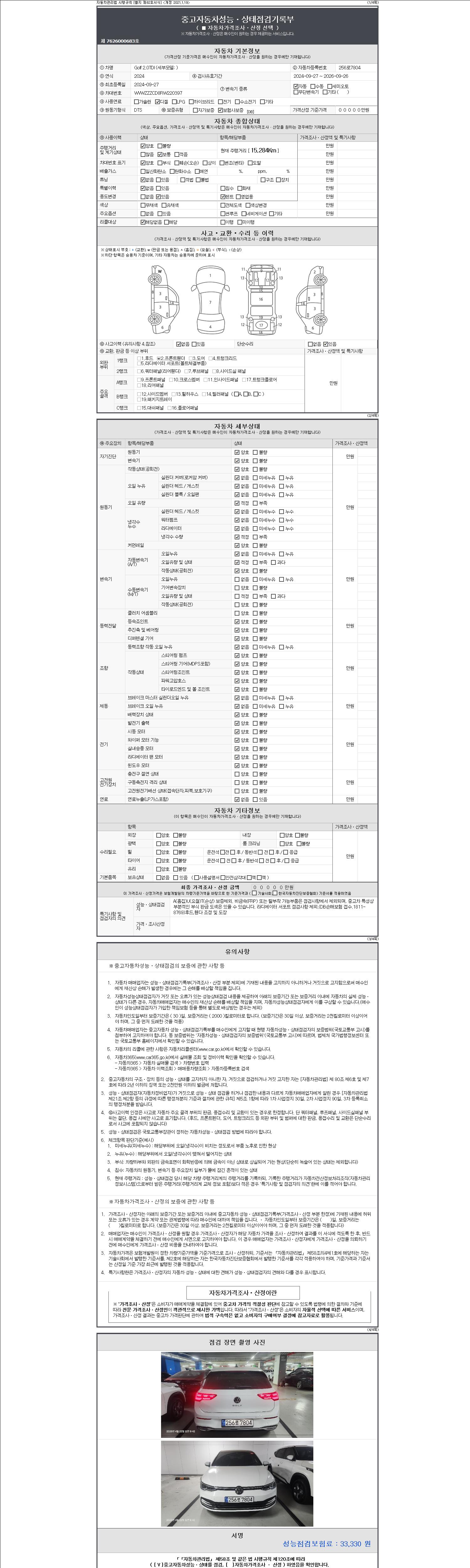 자동차관리법 시행규칙 제120조의 규정에 따라 별지 제 82호서식 《중고자동차 성능, 상태점검 기록부》를 발행한 성능, 상태점검자 및 매매자는 아래의 보증기간 또는 보증거리 이내의 중고자동차, 성능점검 기록부에 기재된 내용과 자동차의 실제 성능, 상태가 다른 경우 계약 또는 관계법령에 따라 매수인에 대하여 책임을 집니다.