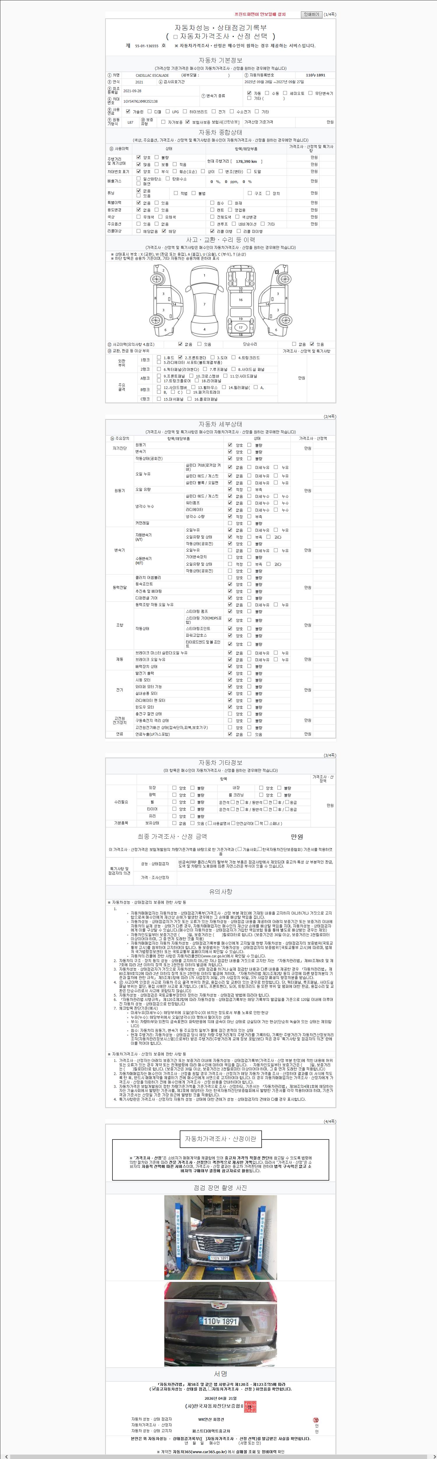 | 주행거리 | 178,390 km | 차량번호 | 110누1891 | 사고유무 | 성능기록부 참조 | 제시번호 | 제 2147483647 호 |