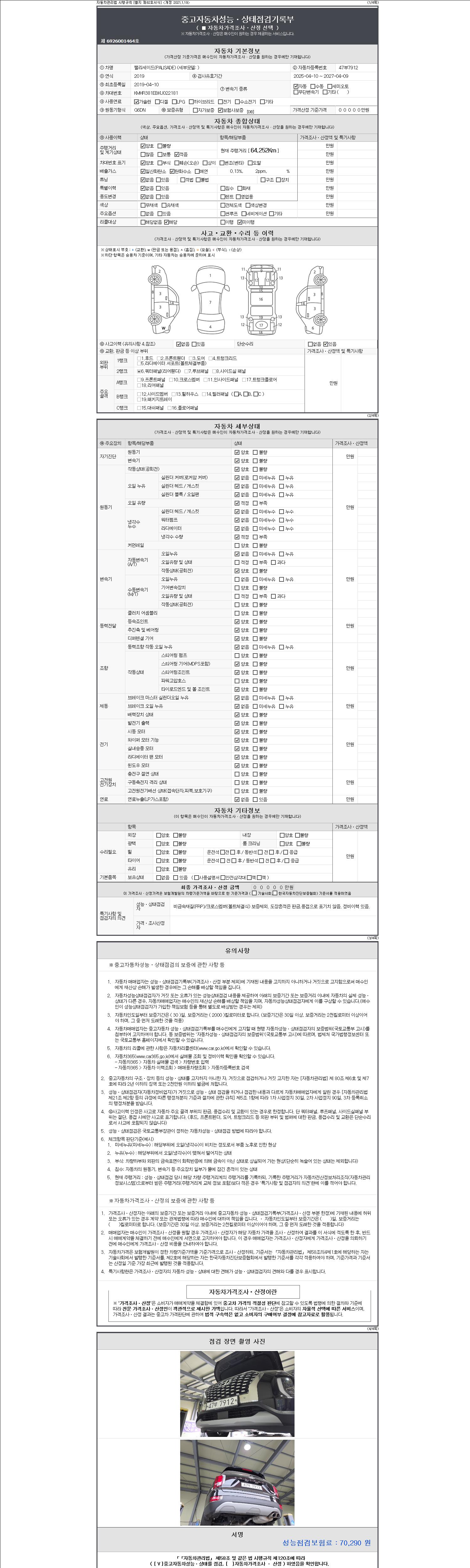 -중고자동차 매매업자를 통해 차량을 구입하실 경우 반드시 "중고자동차 성능, 상태점검 기록부"를 교뷰 받으셔야 하며, 매매업자는 반드시 의무 교부 하여야 압니다.