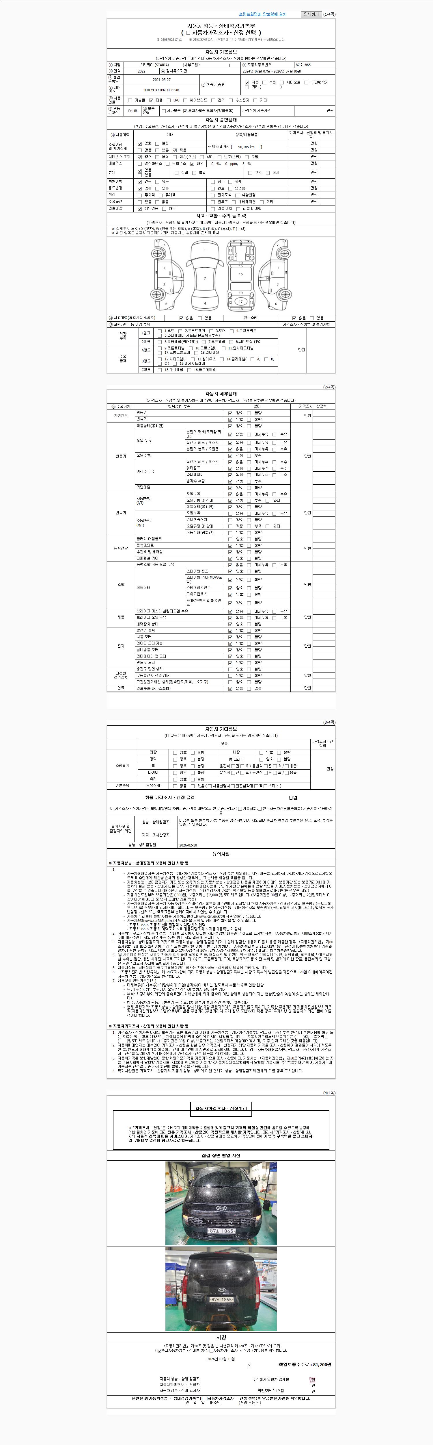 | 주행거리 | 90,185 km | 차량번호 | 87소1865 | 사고유무 | 성능기록부 참조 | 제시번호 | 제 2026007643 호 |