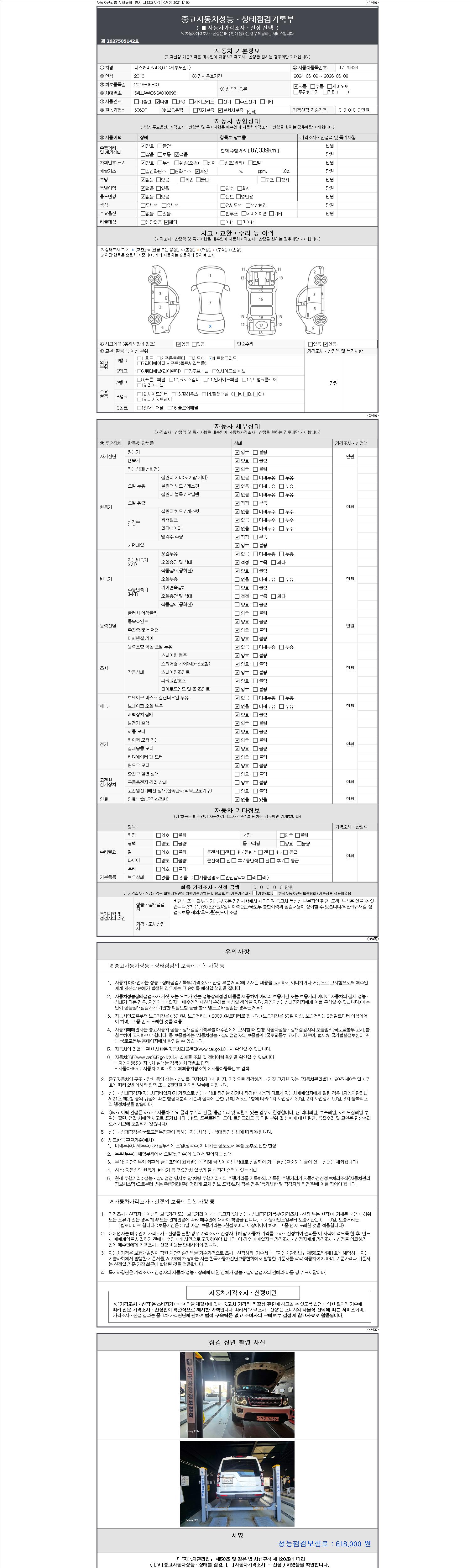 | 주행거리 | 87,326 km | 차량번호 | 17구0636 | 사고유무 | 성능기록부 참조 | 제시번호 | 제 2147483647 호 |