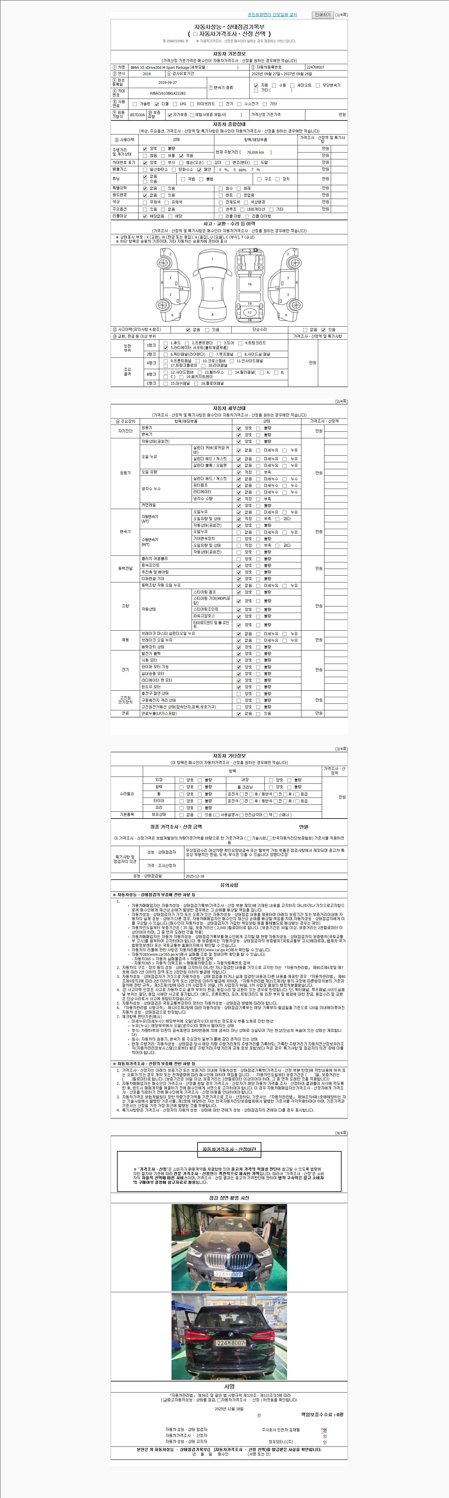 | 주행거리 | 76,006 km | 차량번호 | 224거8007 | 사고유무 | 성능기록부 참조 | 제시번호 | 제 2026009946 호 |