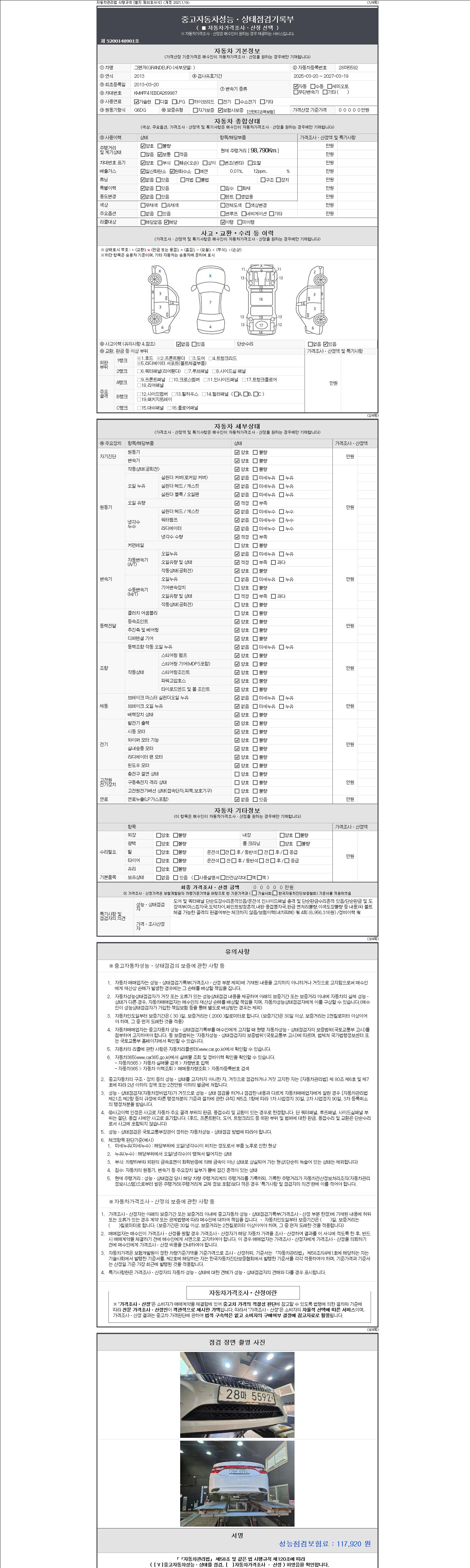 | 주행거리 | 98,669 km | 차량번호 | 28마5592 | 사고유무 | 성능기록부 참조 | 제시번호 | 제 2147483647 호 |