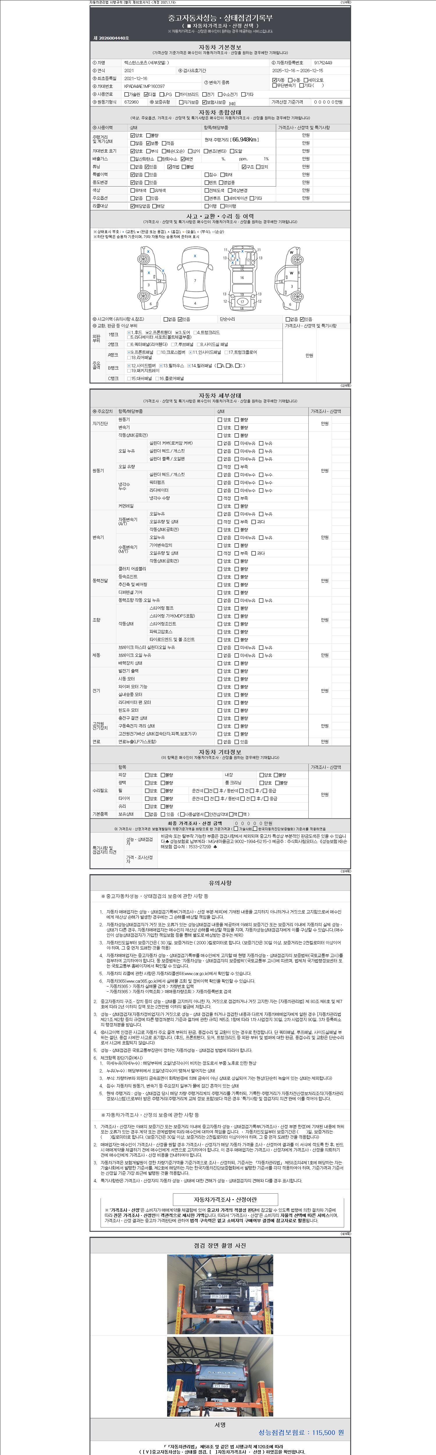 | 주행거리 | 66,948 km | 차량번호 | 91거2449 | 사고유무 | 성능기록부 참조 | 제시번호 | 제 2147483647 호 |