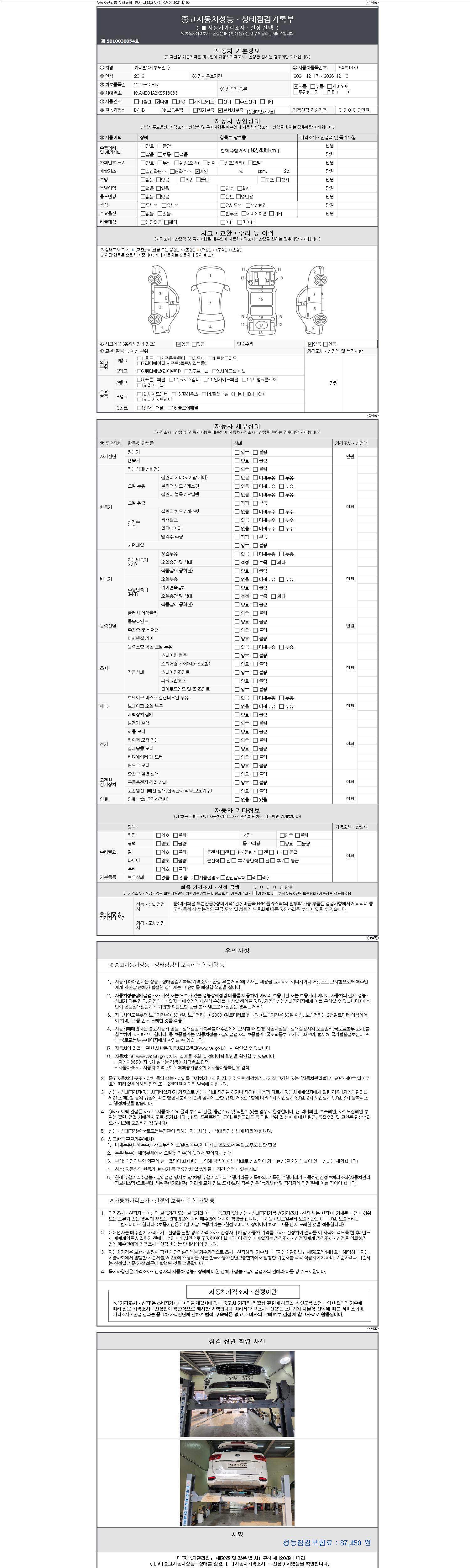 자동차관리법 시행규칙 제120조의 규정에 따라 별지 제 82호서식 《중고자동차 성능, 상태점검 기록부》를 발행한 성능, 상태점검자 및 매매자는 아래의 보증기간 또는 보증거리 이내의 중고자동차, 성능점검 기록부에 기재된 내용과 자동차의 실제 성능, 상태가 다른 경우 계약 또는 관계법령에 따라 매수인에 대하여 책임을 집니다.