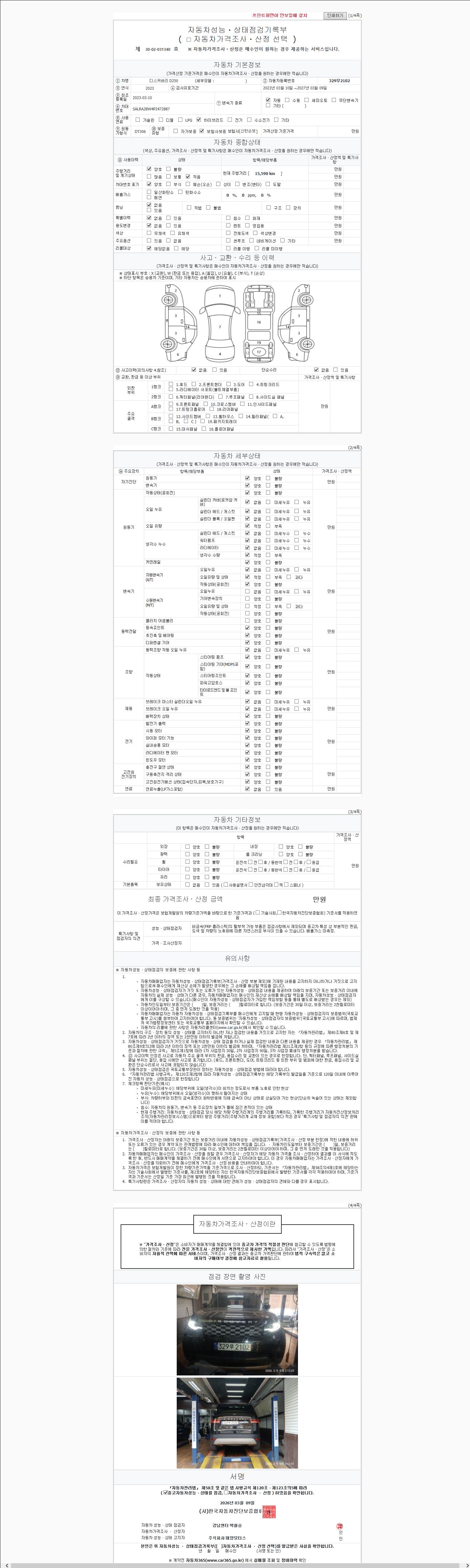 | 주행거리 | 15,610 km | 차량번호 | 329무2102 | 사고유무 | 성능기록부 참조 | 제시번호 | 제 2026034562 호 |
