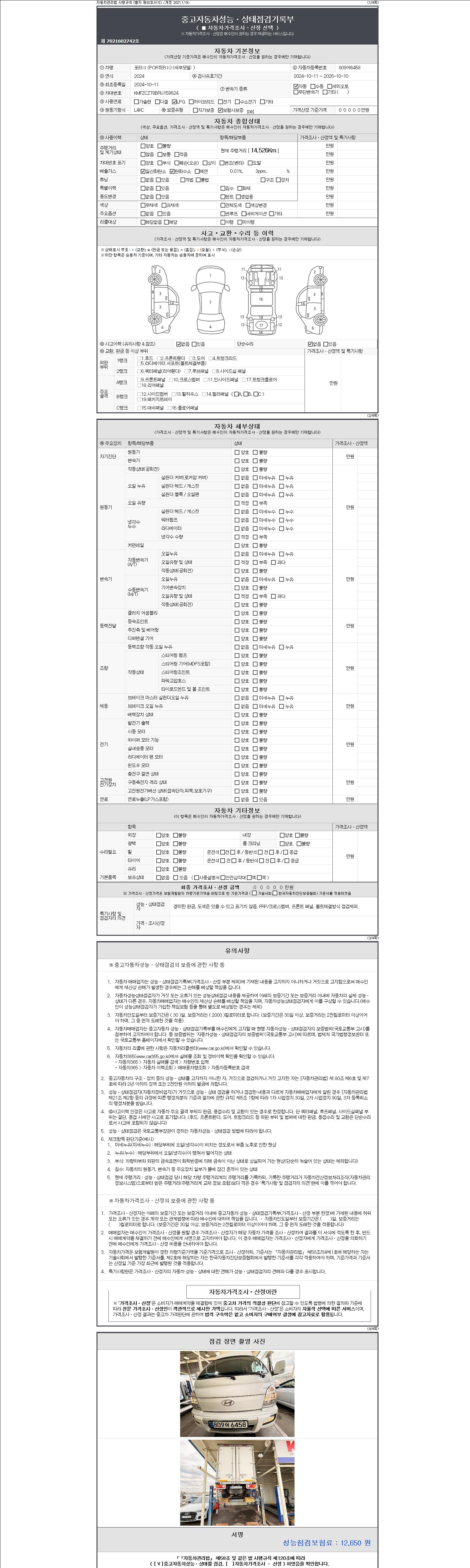 자동차관리법 시행규칙 제120조의 규정에 따라 별지 제 82호서식 《중고자동차 성능, 상태점검 기록부》를 발행한 성능, 상태점검자 및 매매자는 아래의 보증기간 또는 보증거리 이내의 중고자동차, 성능점검 기록부에 기재된 내용과 자동차의 실제 성능, 상태가 다른 경우 계약 또는 관계법령에 따라 매수인에 대하여 책임을 집니다.