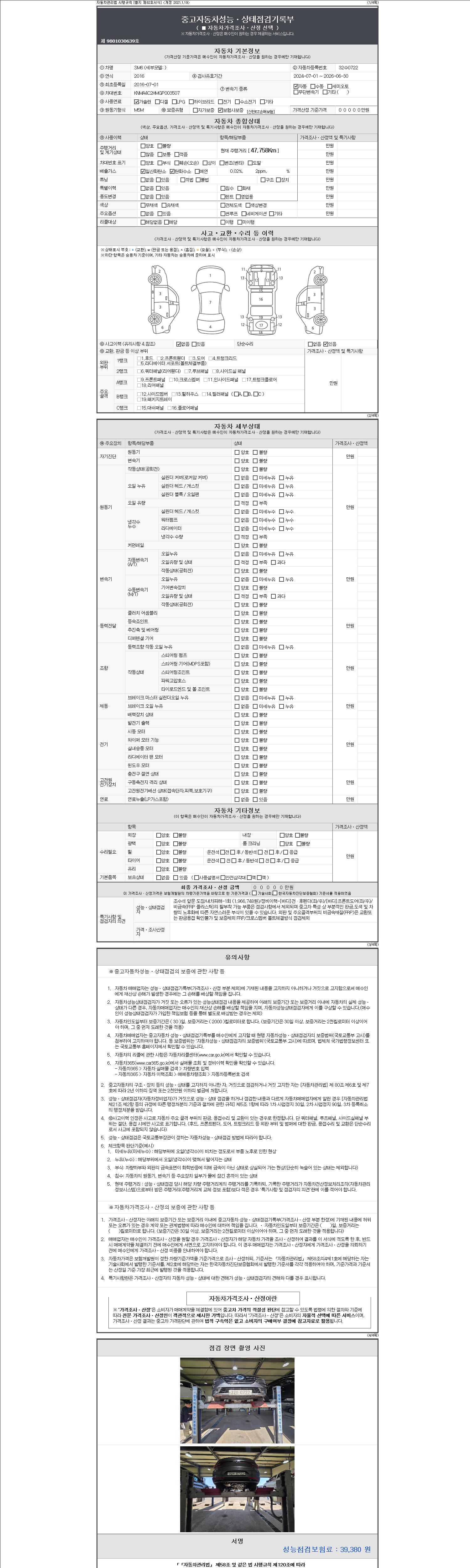 자동차관리법 시행규칙 제120조의 규정에 따라 별지 제 82호서식 《중고자동차 성능, 상태점검 기록부》를 발행한 성능, 상태점검자 및 매매자는 아래의 보증기간 또는 보증거리 이내의 중고자동차, 성능점검 기록부에 기재된 내용과 자동차의 실제 성능, 상태가 다른 경우 계약 또는 관계법령에 따라 매수인에 대하여 책임을 집니다.